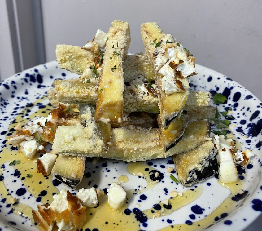 Bastones de berenjena rebozados, bañados en miel emulsionada, queso de cabra y almendras 9,50€