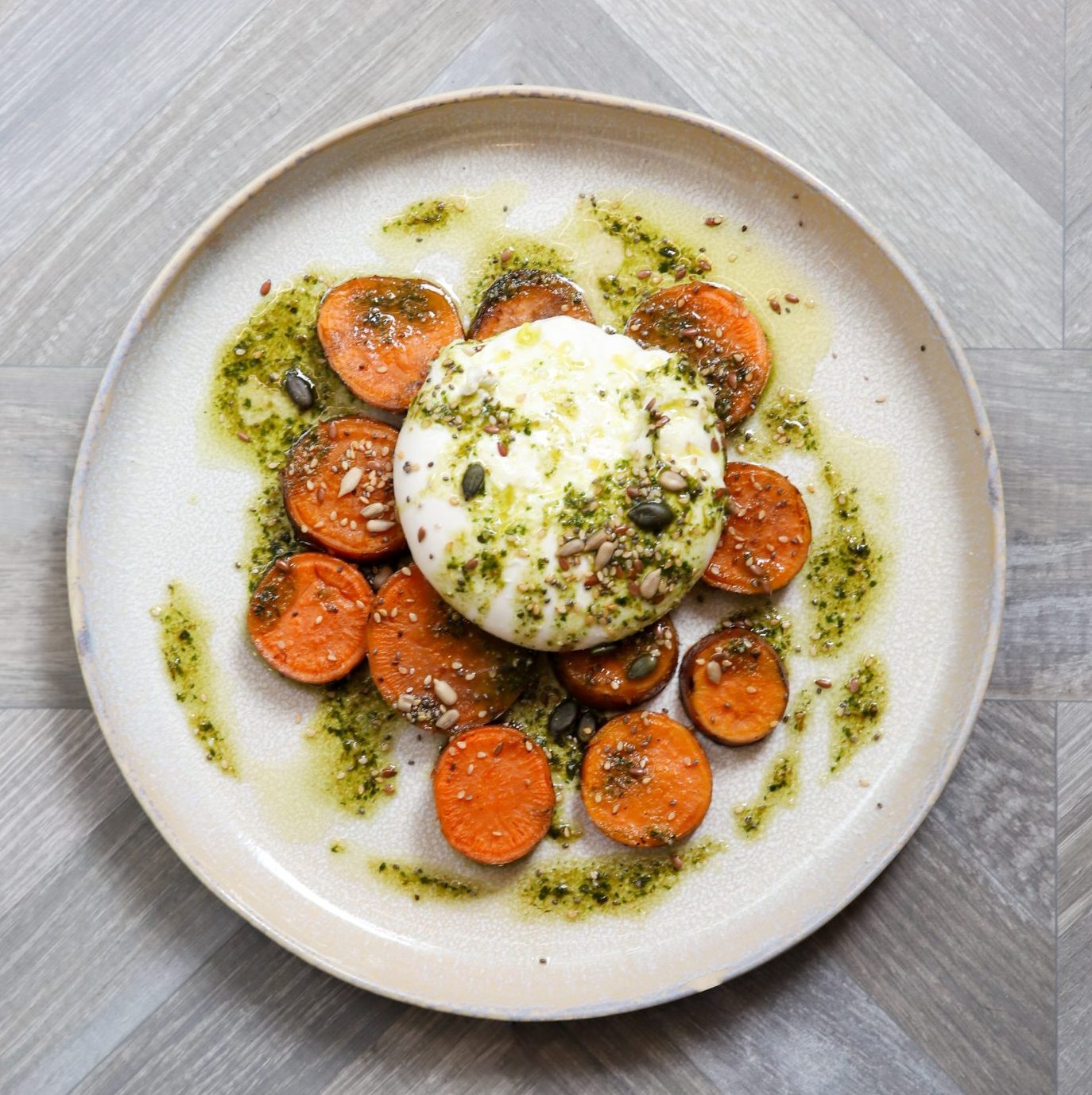 Boniatos asados con burrata, pesto casero y semillas 14,90€