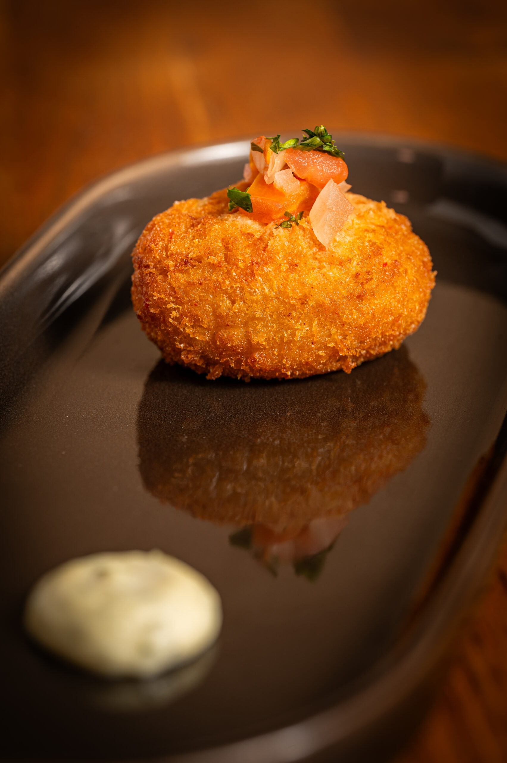 Filete de lubina rebozado en panko japonés, bañado en salsa coreana (dulce y poco picante), pepinillos caseros, col con salsa de yogurt y top de cebollino y sésamo.