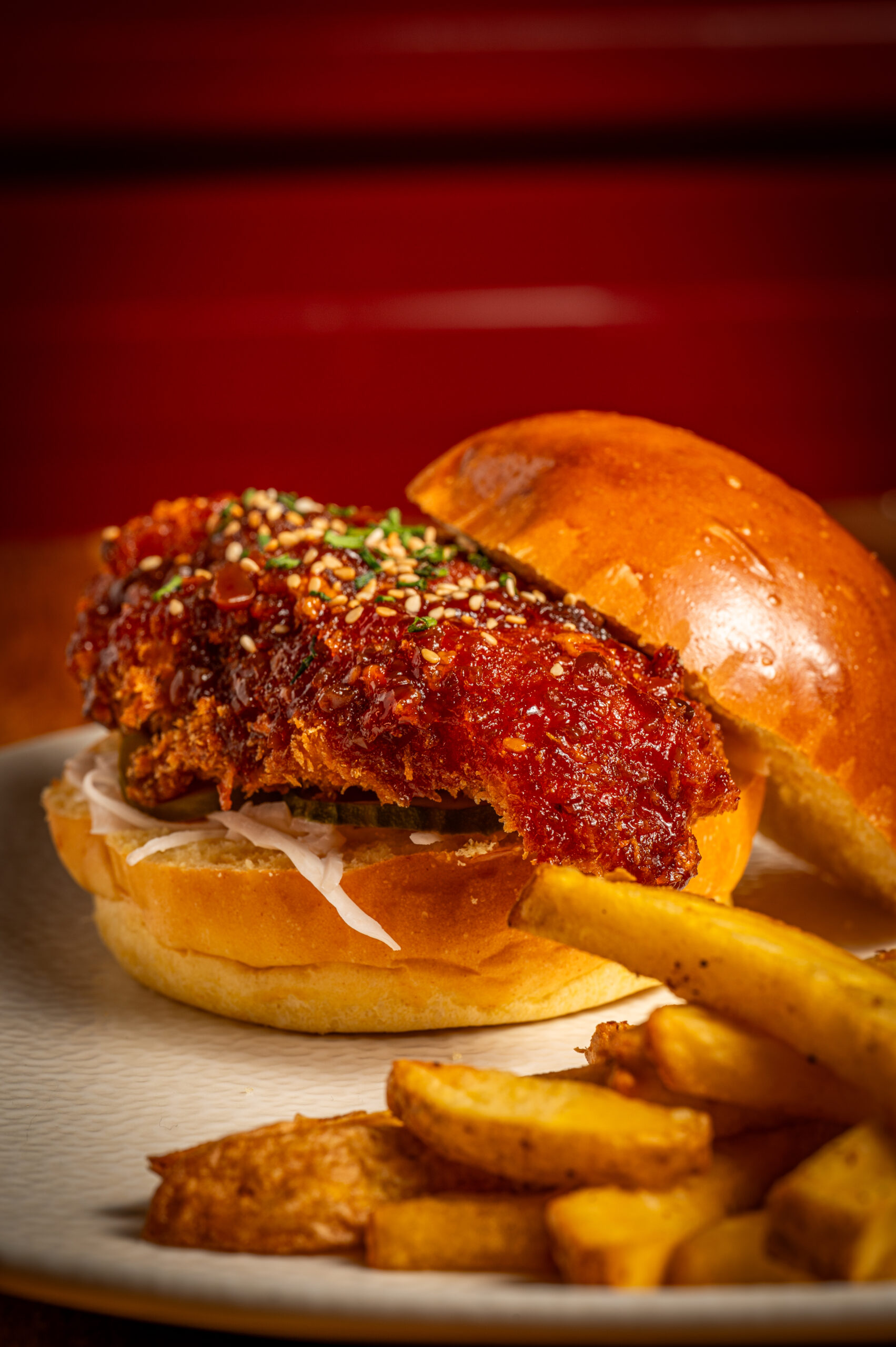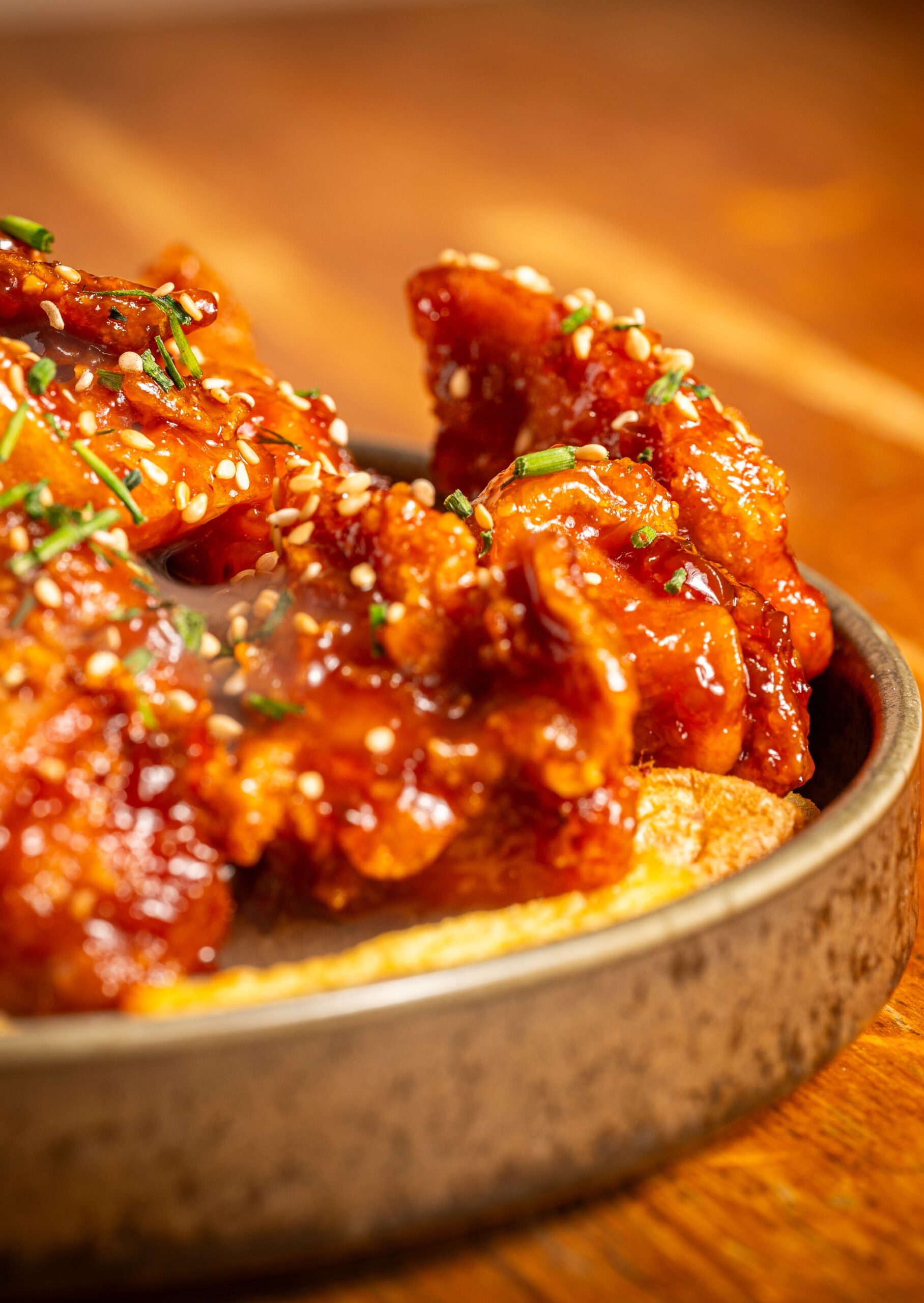 Típica comida callejera coreana, pollo rebozado cubierto con una salsa picante y dulce. semillas de sésamo y cebollín fresco.