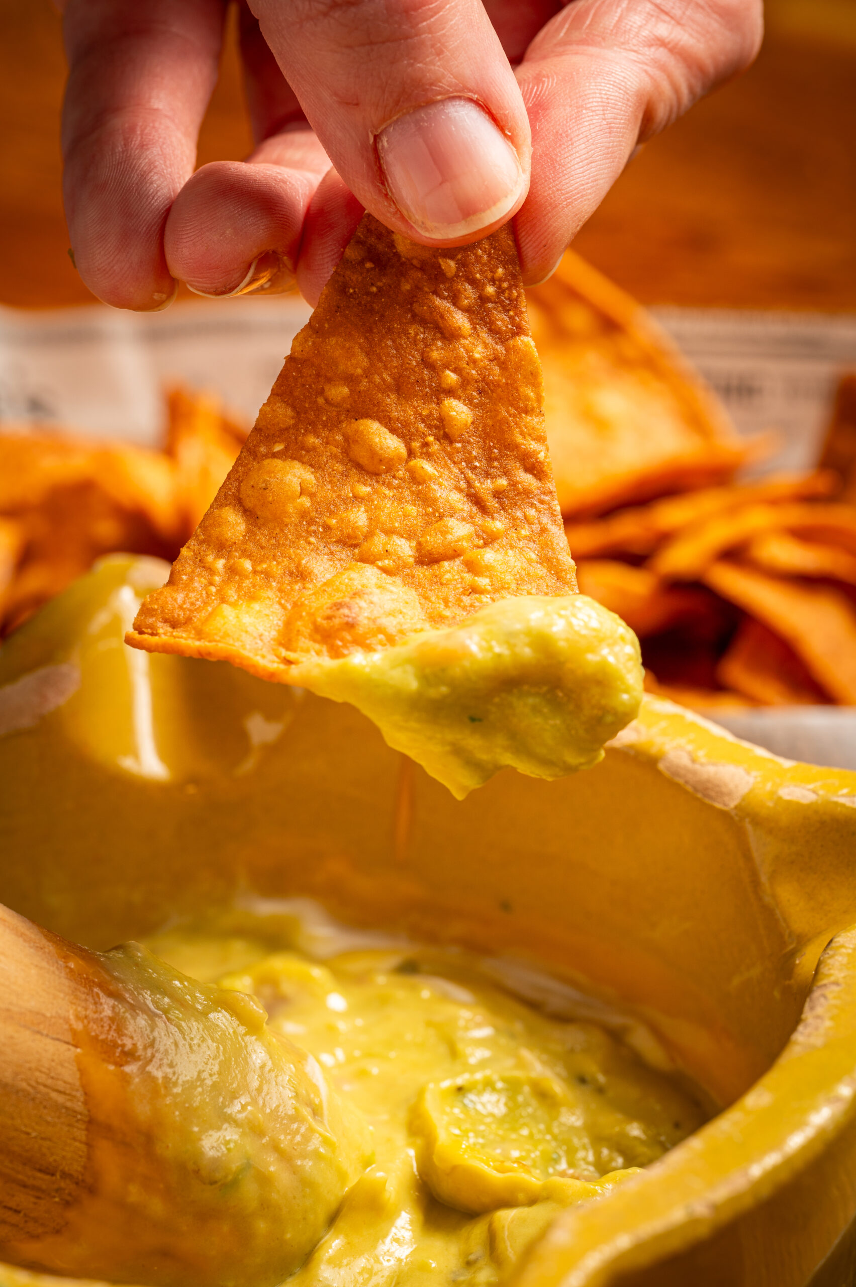 Ternera deshilachada guisada con guacamole casero, queso, y totopos.