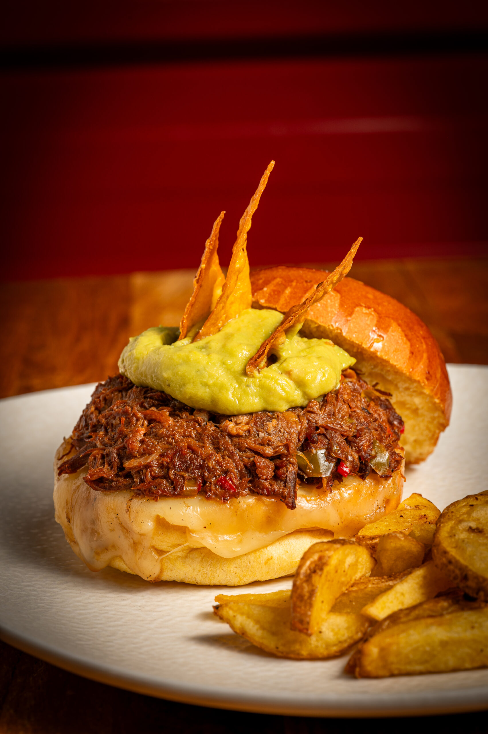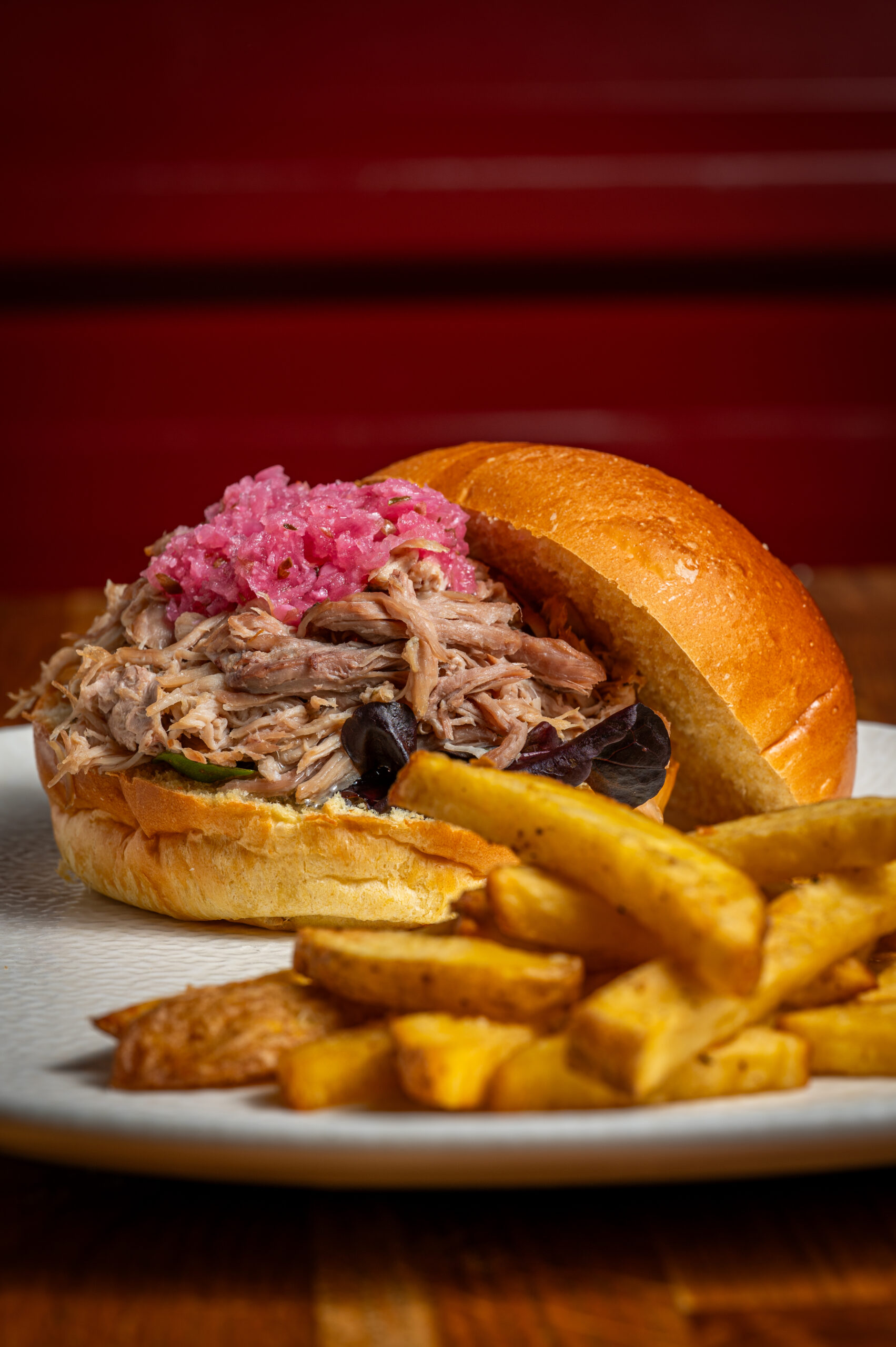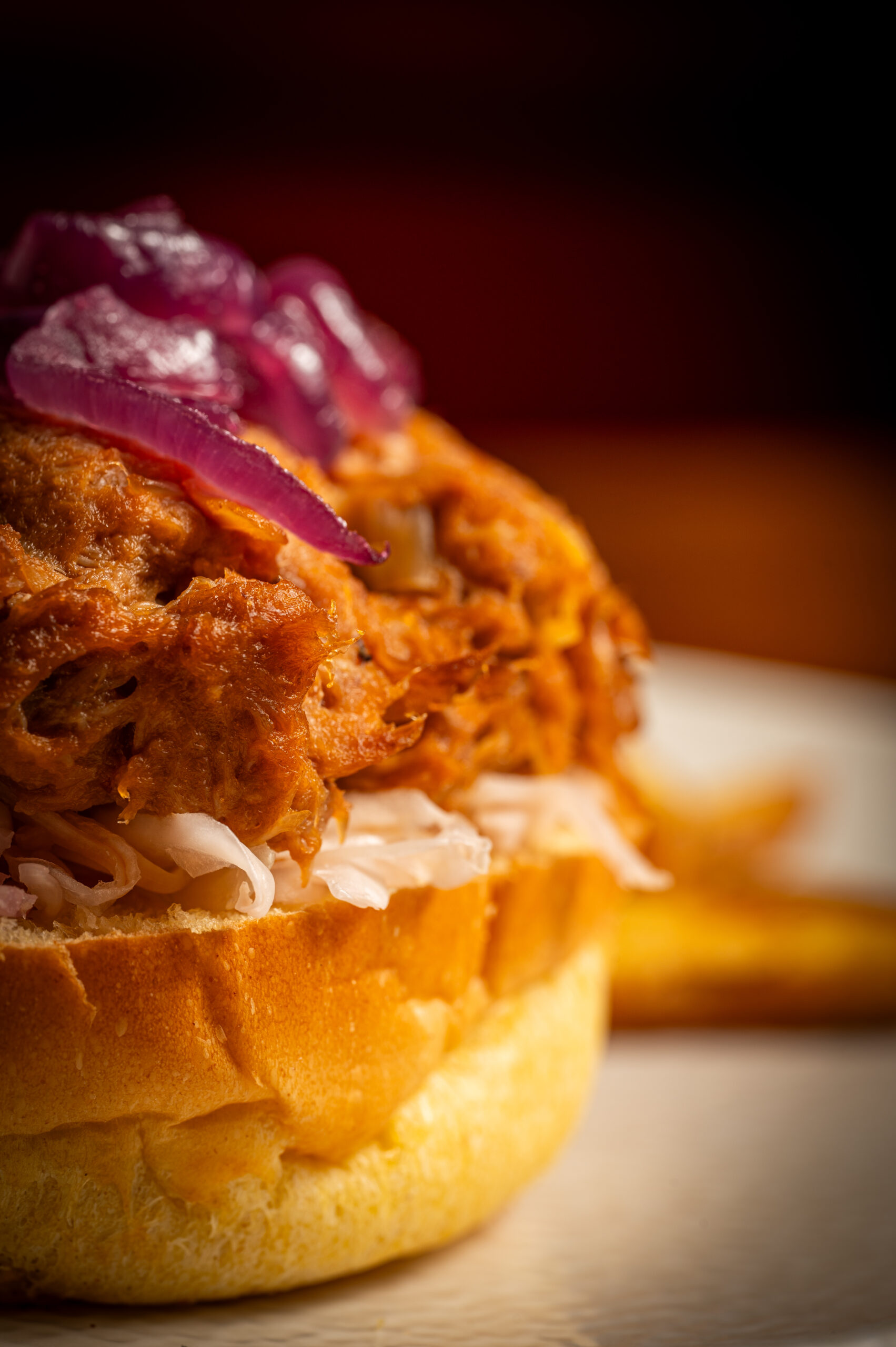 Carne de costillas hechas pulled pork con salsa BBQ ahumada con un toque picante, cebolla caramelizada, col en vinagre, cebolla morada y perejil fresco de la huerta.