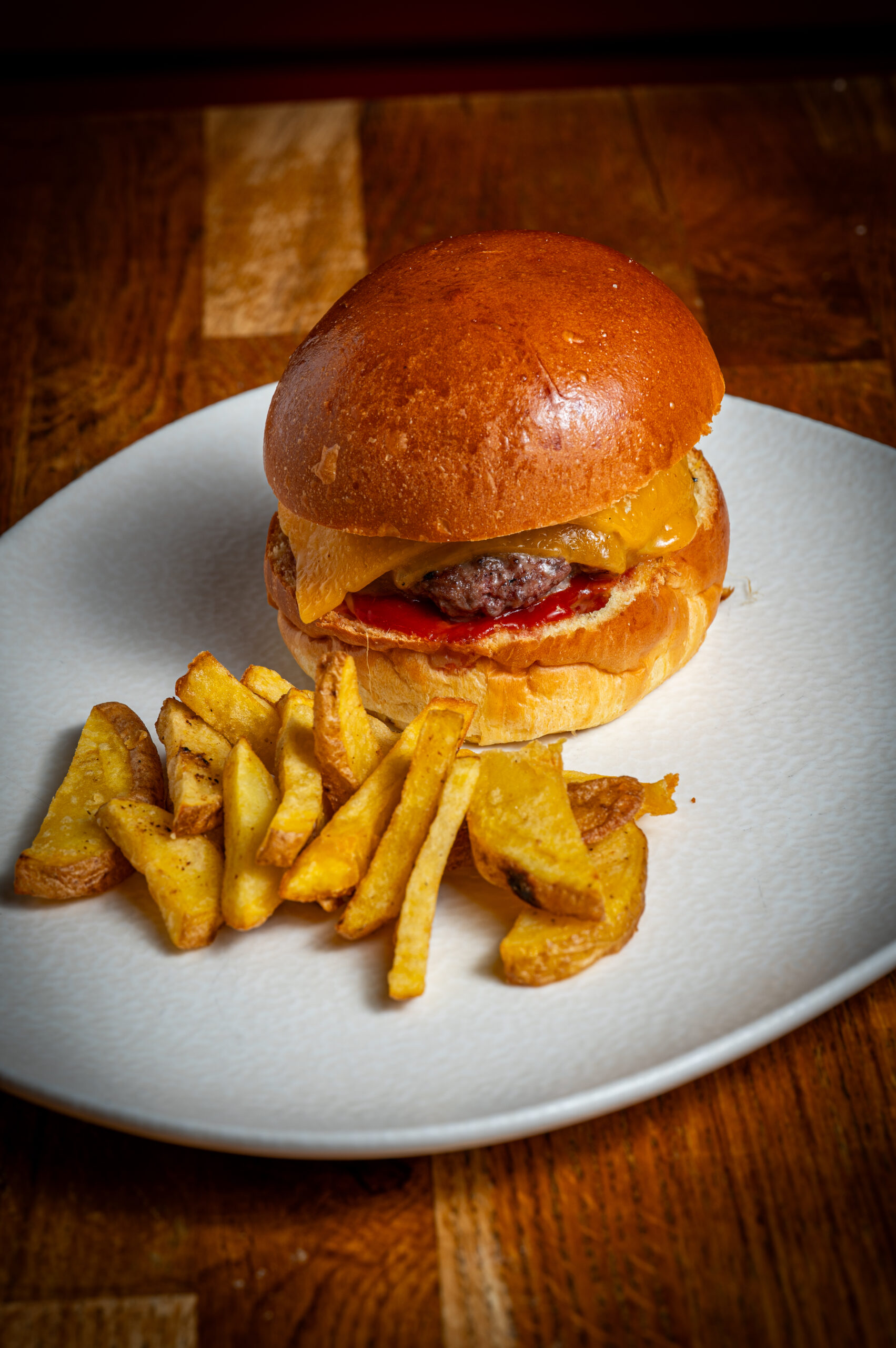 Carne de ternera a la plancha, queso cheddar y ketchup, acompañado de patatas fritas.