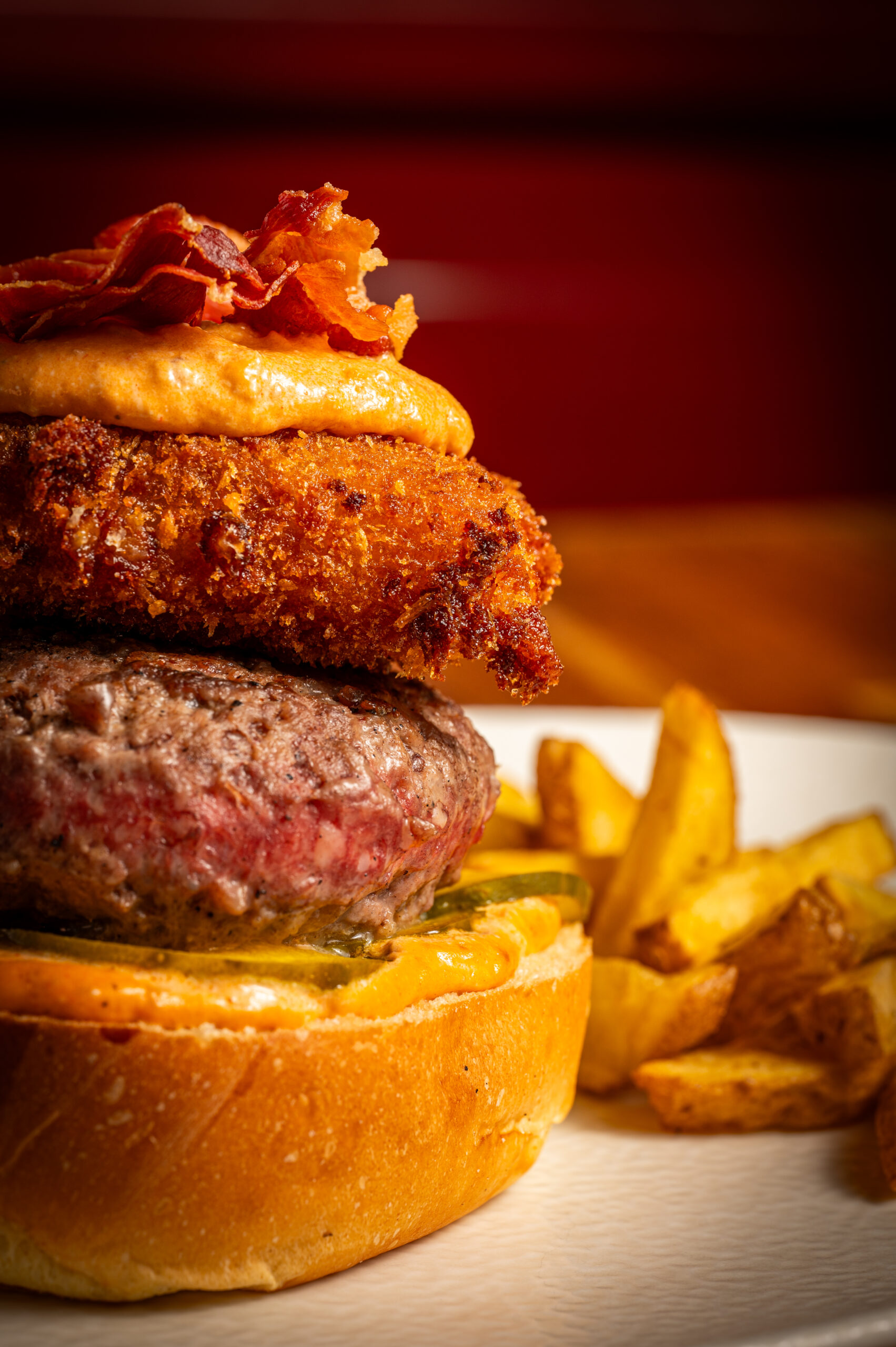 Pollo crujiente rebozado en panko japonés con lechuga, rulo de cabra, mix de bacon y cebolla caramelizada y nuestra salsa ahumada.