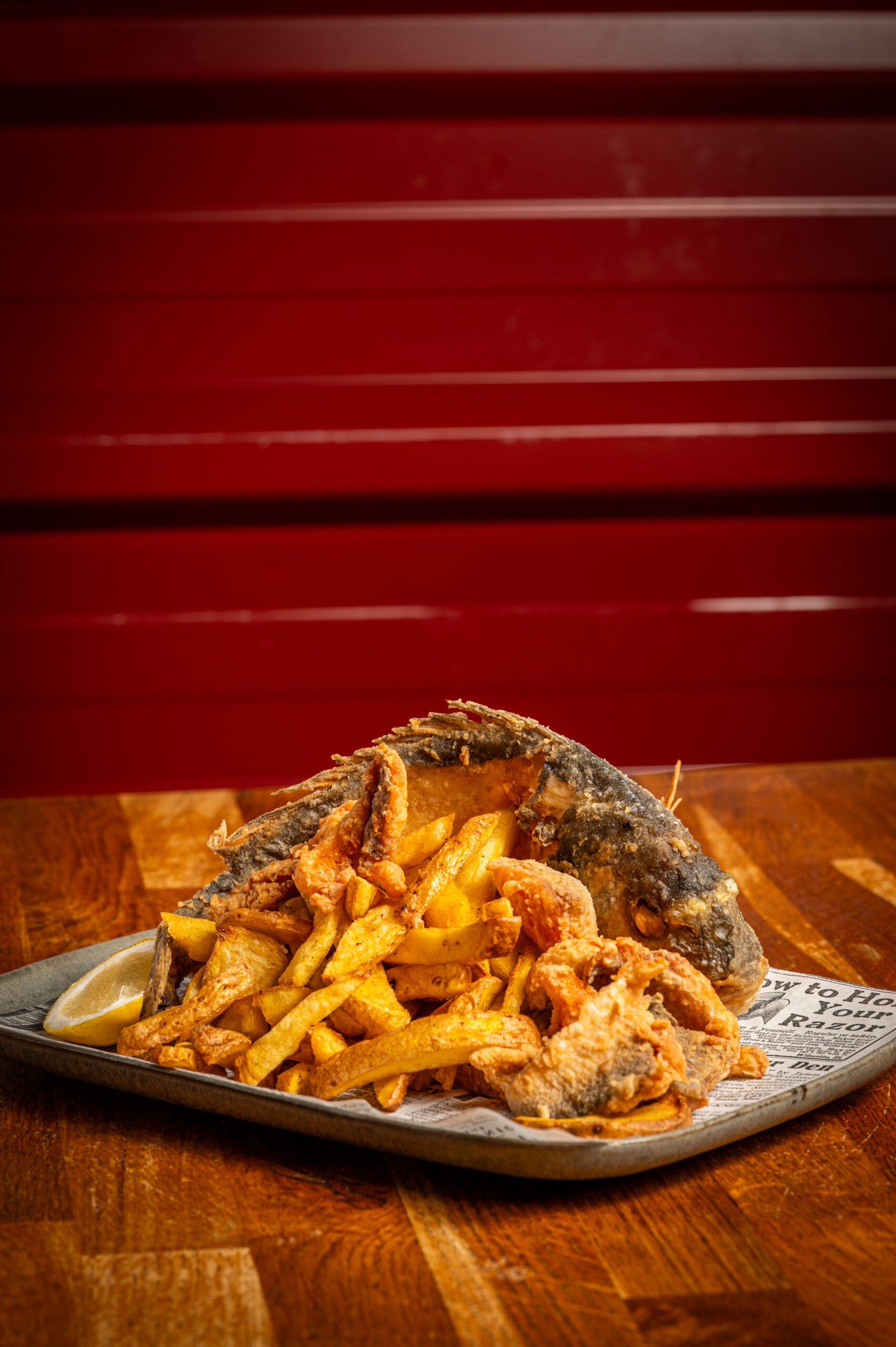 Dorada fresca cortada a trozos. frita y servida sobre su propia raspa, acompañada de salsa de miel y mostaza, salsa de perejil y ajo y por último, salsa picante.