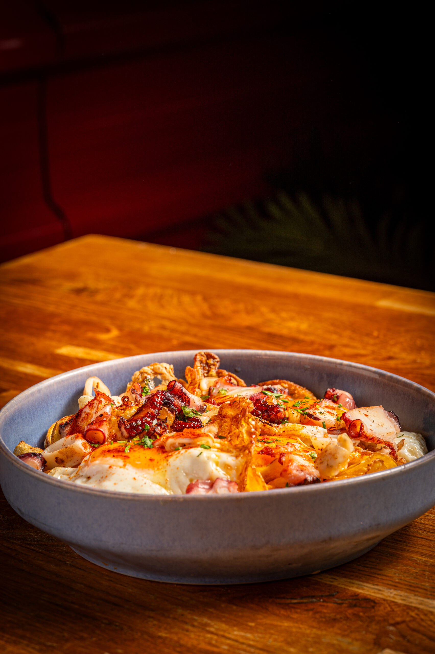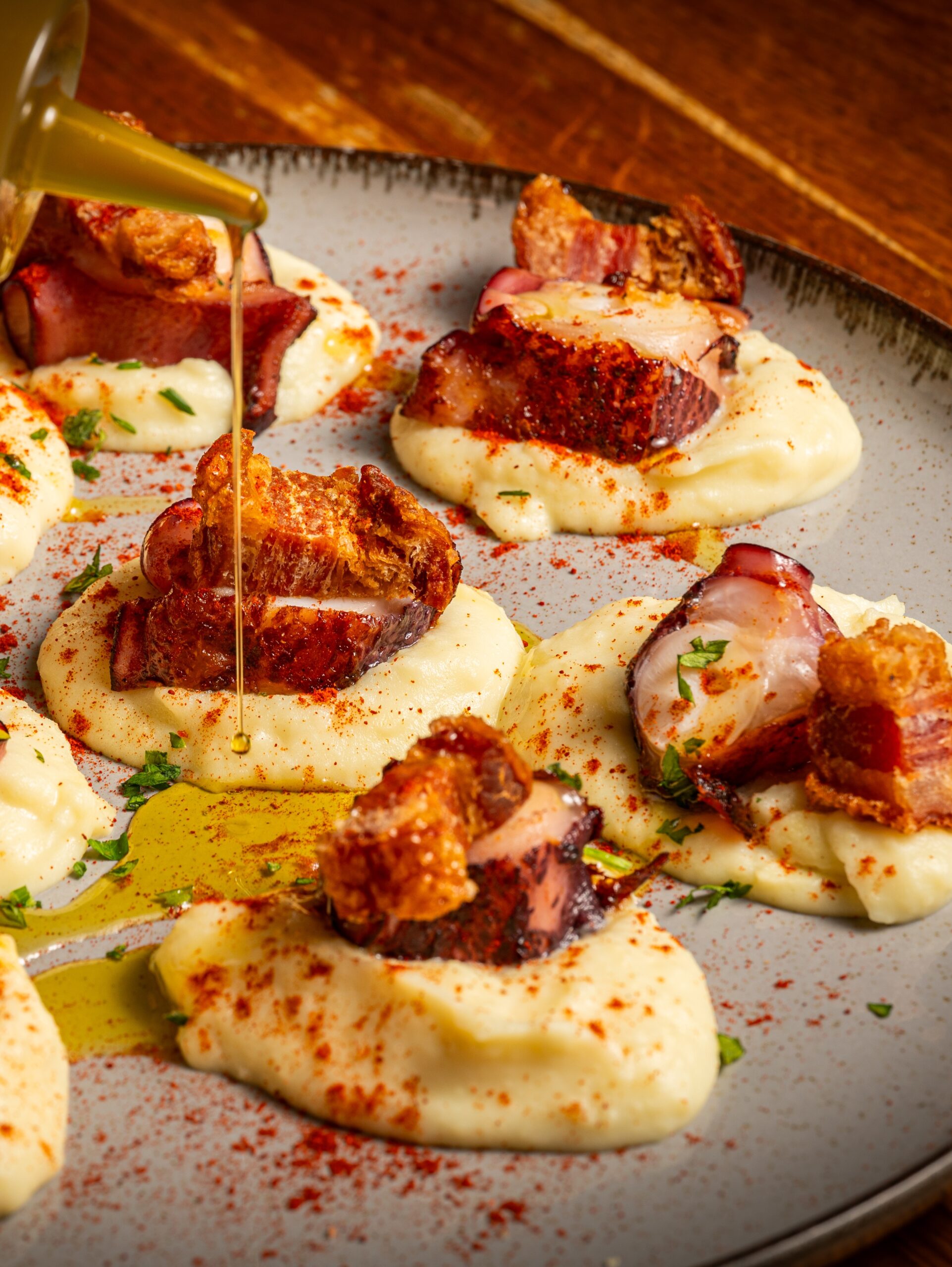 Pata de pulpo sobre suave baqse de parmienter de patatas con chips de torreznos y pimenton.