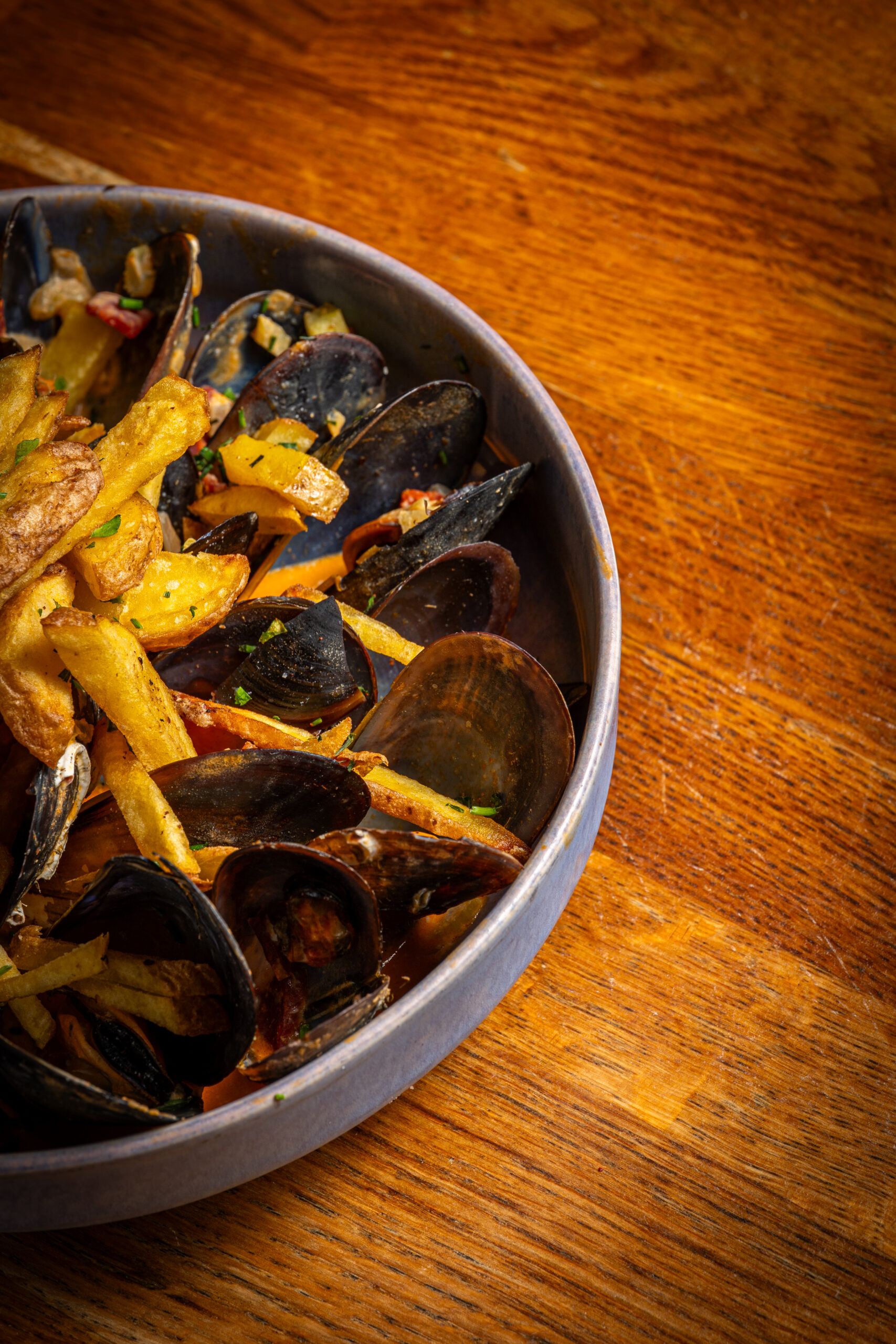 Mejillones en salsa de curry, chorizo y apio, acompañados de patatas fritas 14,50€