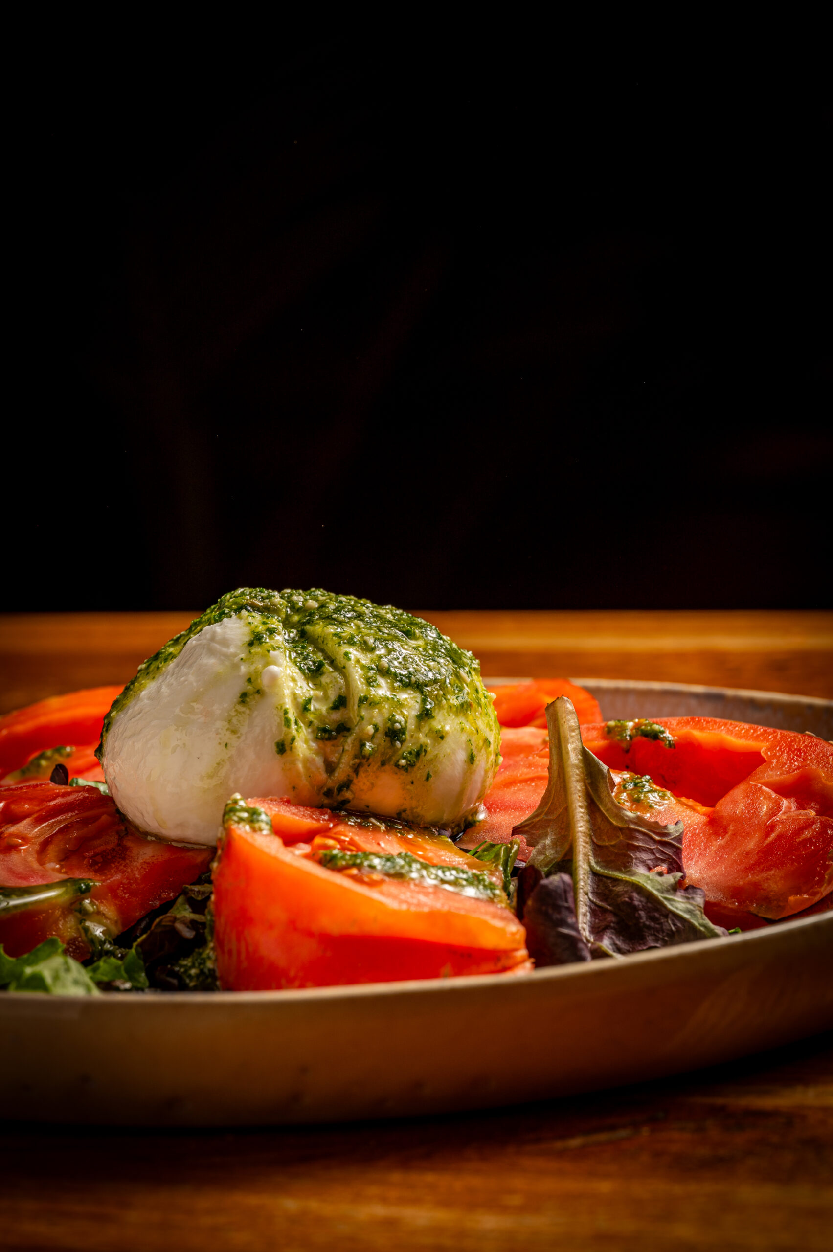 Ensalada con tomates de temporada, pesto casero, burrata y aguacate
