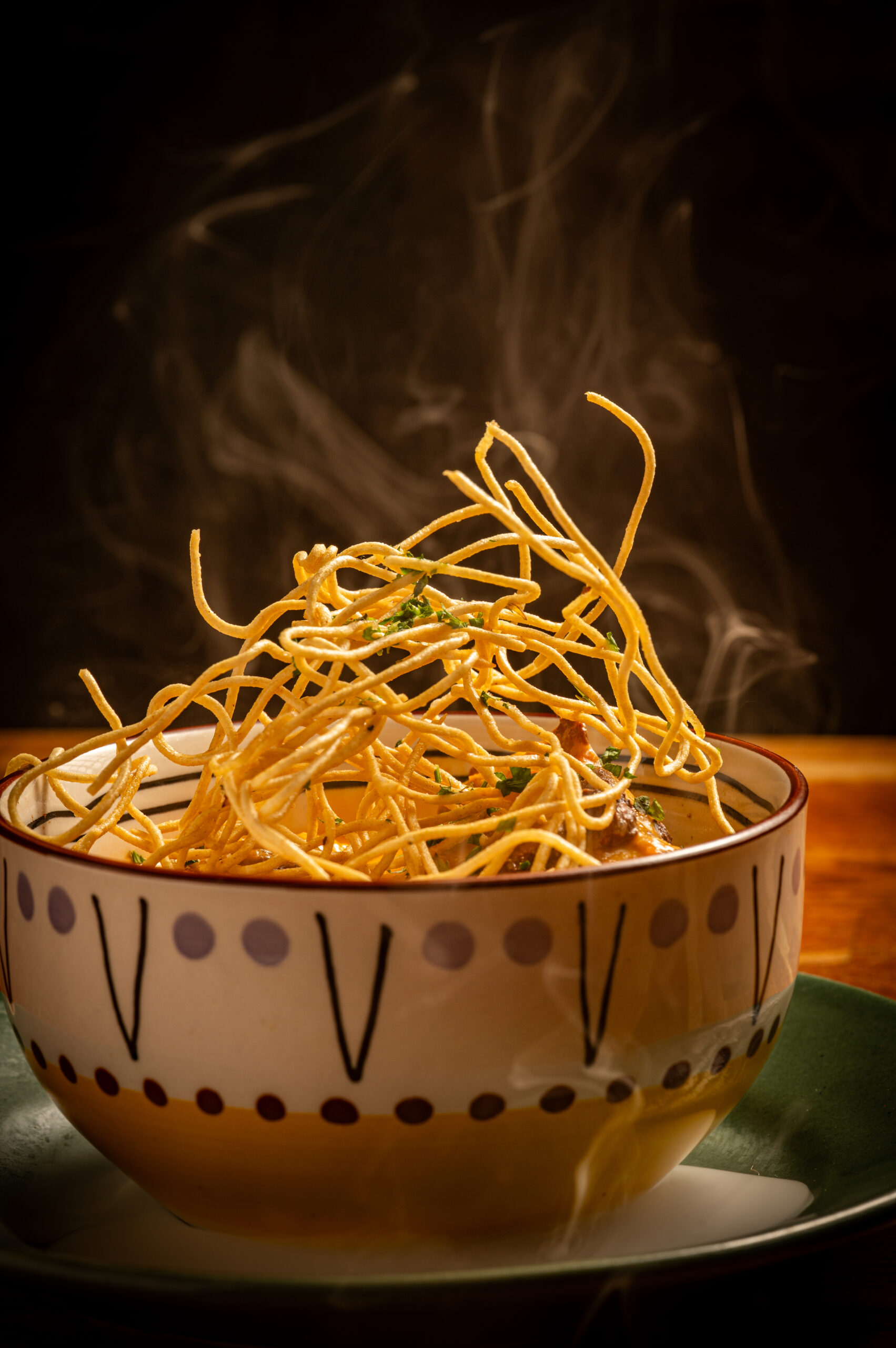Plato a base de curry rojo. leche de coco, cilantro y especias con top de crujiente de fideos.
