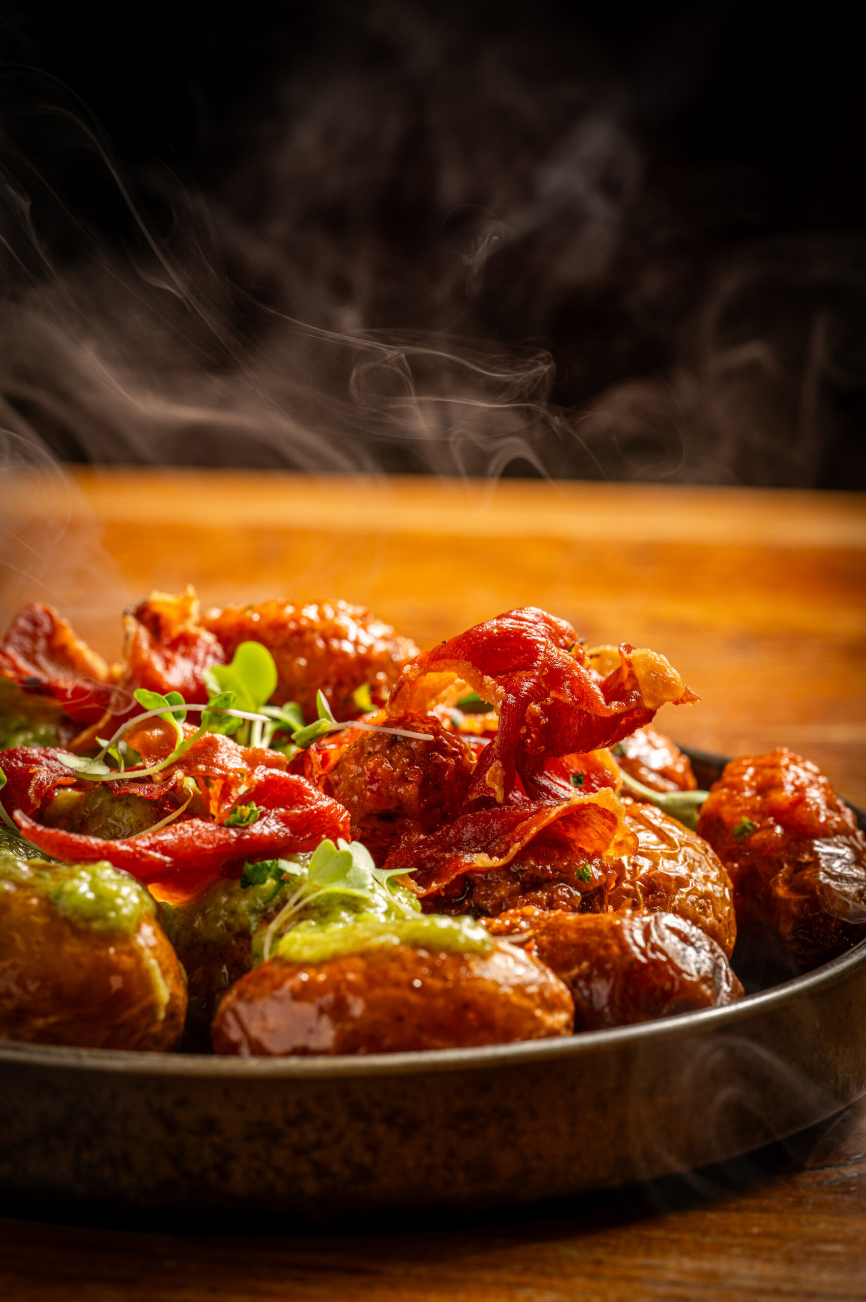 Patatas arrugadas al estilo canario con mojo rojo, verde y virutas de jamón crujiente 12,50€